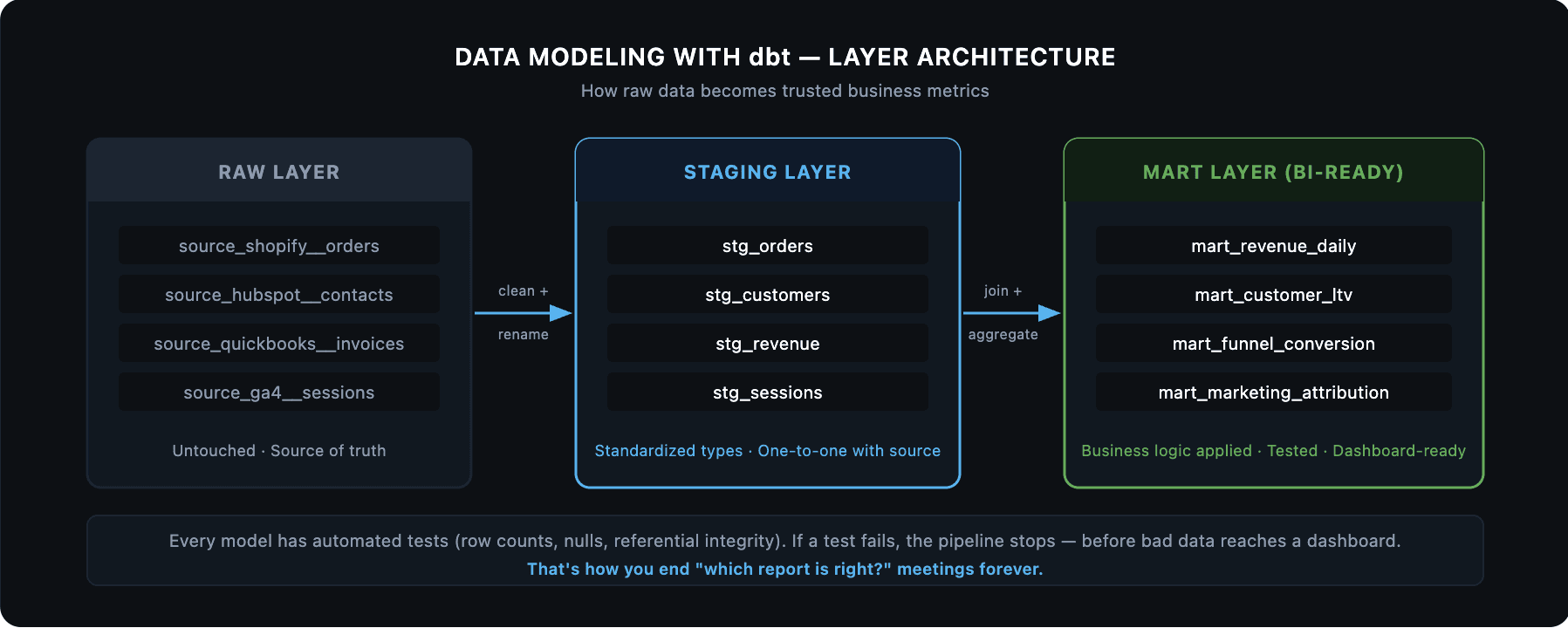 This is where most projects either earn trust or lose it. Good data models are the reason a dashboard number means something. Bad ones are why every meeting starts with "which report is right?"
